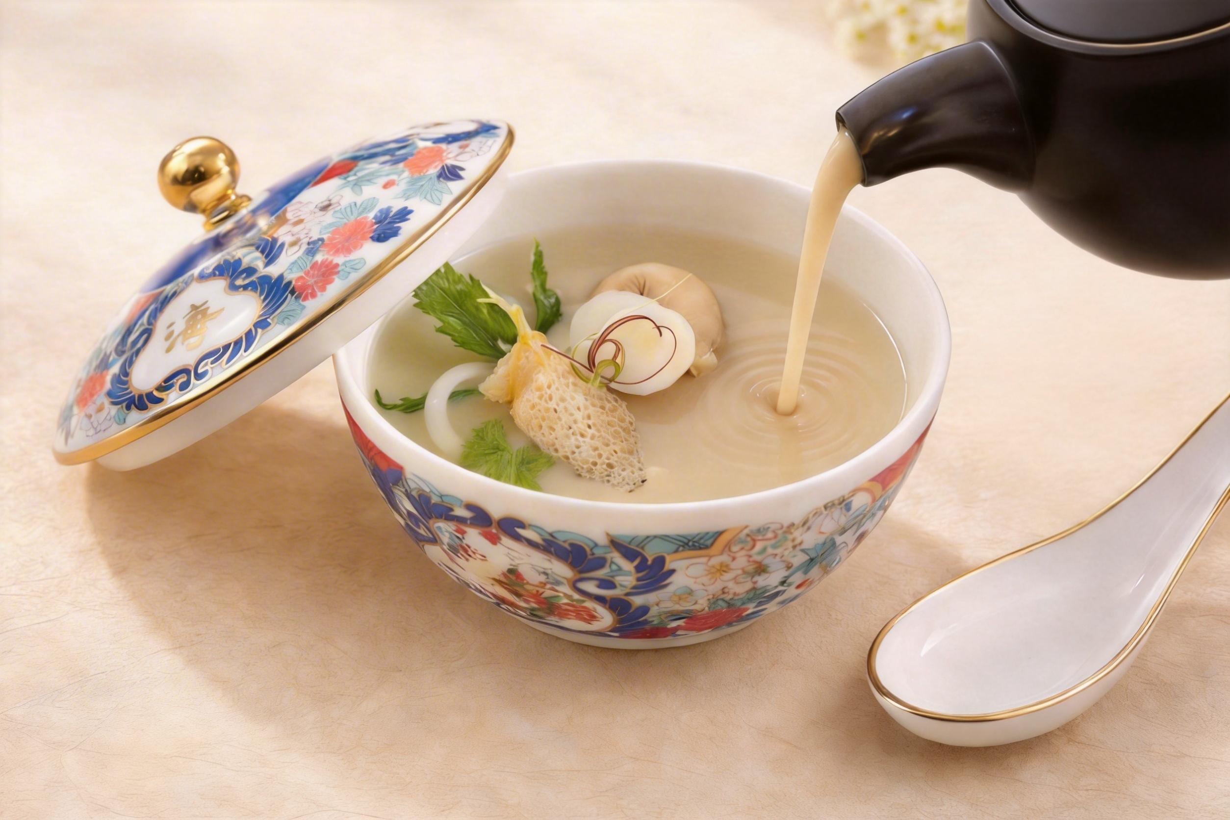 春雨が静かに降り注ぎ、湿気がじわりと体に忍び込む季節。シェフは古法の四神(スーシェン)の知恵に倣い、薬草を丁寧に挽いてじっくりと煮出し、絹のようになめらかな湯底を仕上げます。体内の湿気を払い、気を補い、心身をほぐすことを目的とした一椀です。